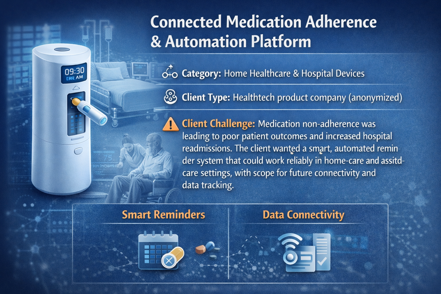 Medication non-adherence was leading to poor patient outcomes and increased hospital readmissions. The client required a reliable automated reminder and dispensing system suitable for home-care and assisted-care settings, with future-ready connectivity.